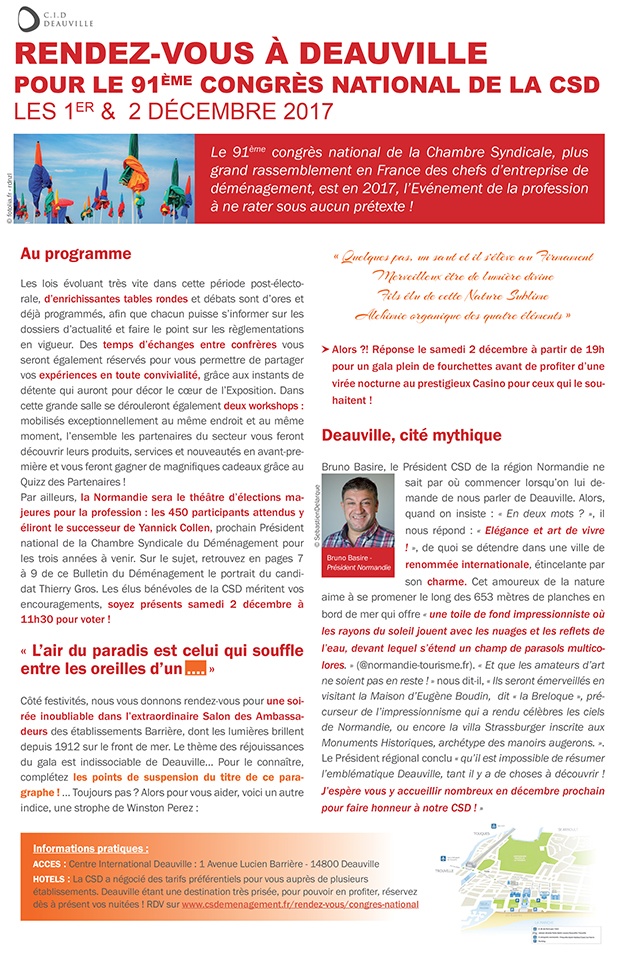 Deauville sera par ailleurs le théâtre de scrutins majeurs pour la profession : les 450 participants attendus y éliront le prochain Président national de la Chambre Syndicale du Déménagement pour les trois années à venir, succédant ainsi à Yannick Collen, ainsi deux Vice-présidents et le Trésorier. Egalement soumises aux votes des adhérents, des propositions de modifications statutaires de la CSD vous seront présentées. Pour exprimer votre soutien, vos choix et donner votre voix, soyez présents
