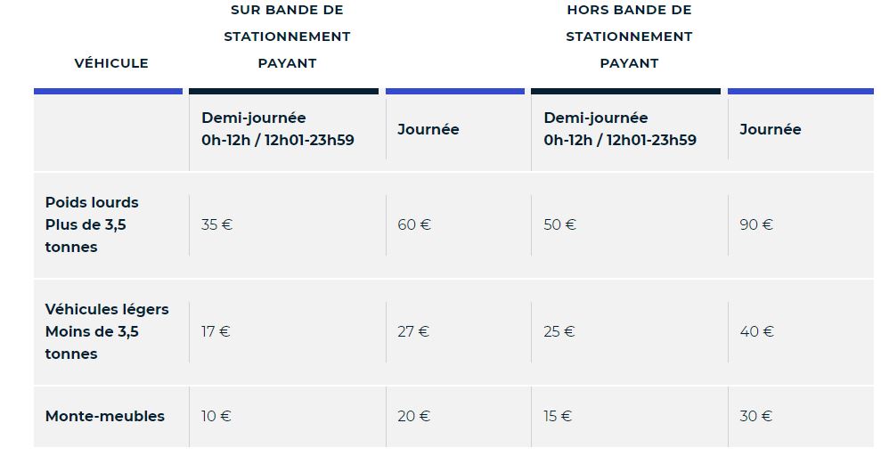 A compter du 01/03/2022 et hors toute concertation préalable avec les professionnels du déménagement, la délivrance par le téléservice des autorisations de stationnement (AOT) pour le déménagement est tarifée selon les modalités ci-après, en fonction du temps d’occupation (1/2 journée, journée), du tonnage du véhicule (+/- 3,5 t), de l’usage éventuel d’un monte-meubles et de la localisation visée dans l’autorisation (dans la bande payante ou hors de celle-ci).