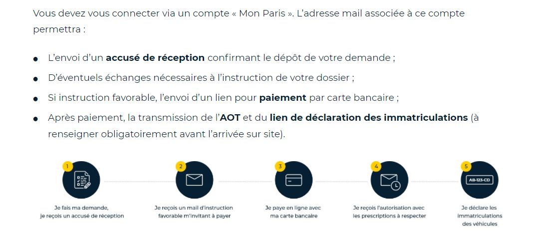 La délivrance de l’autorisation sera soumise au paiement préalable effectif de la redevance de stationnement, selon le process ci-après :